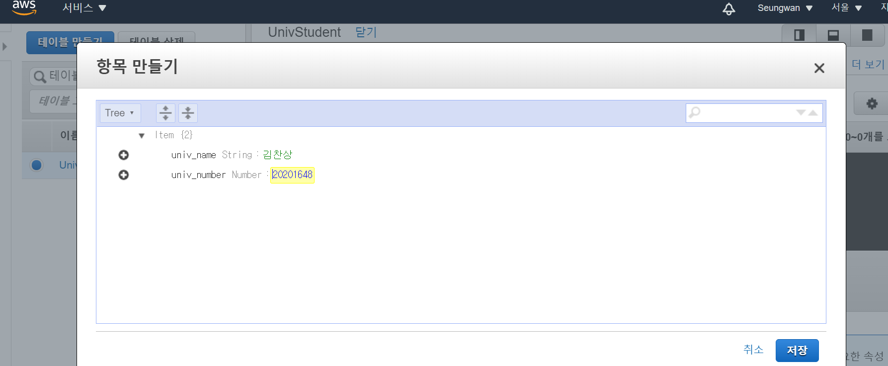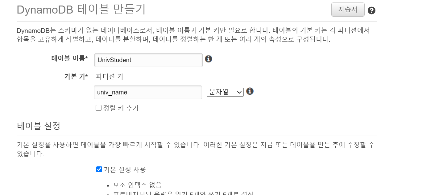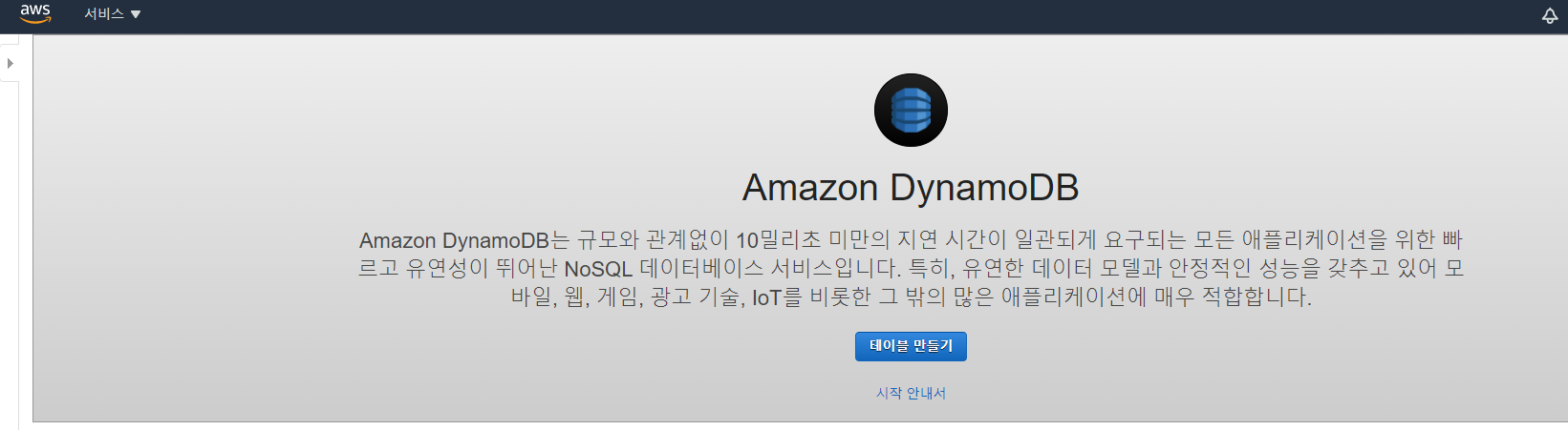 다이나모DB 선택후, 테이블 만들기를 합니다.