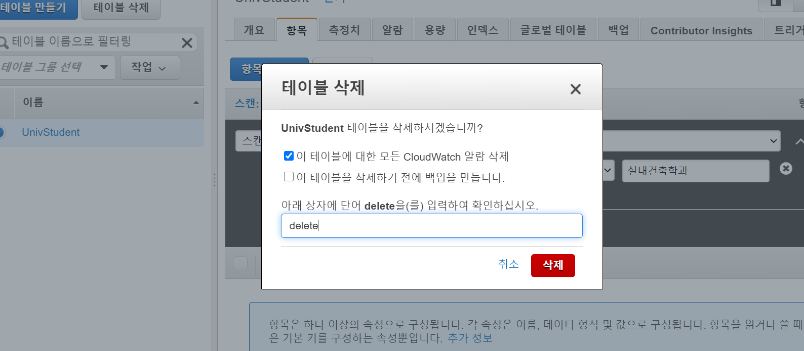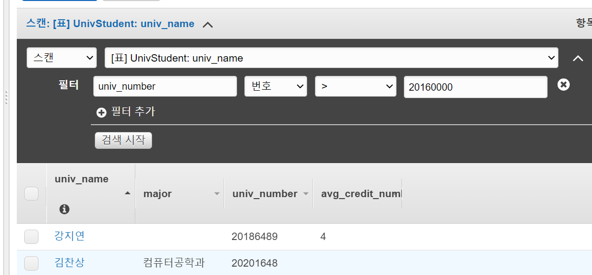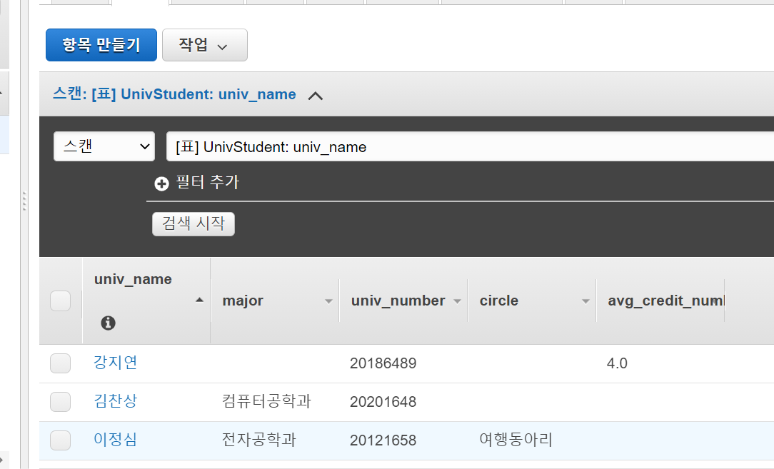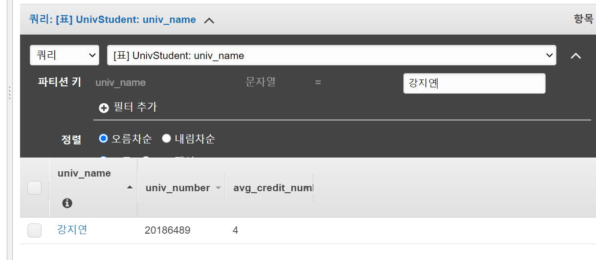 AWS 웹콘솔 → 데이터 질의 → 다이나모DB